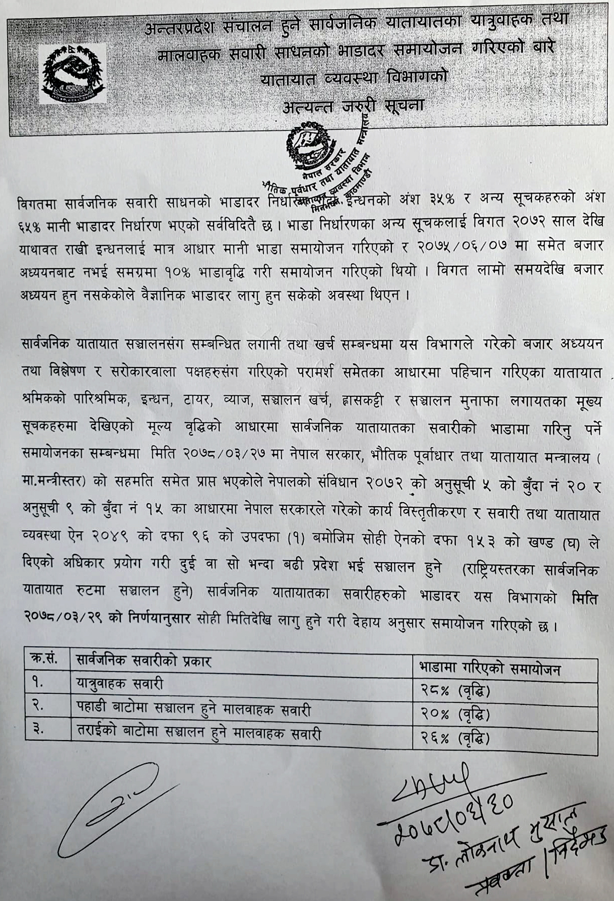 यातायात व्यवस्था ऐन, २०४९ को दफा ९६ को उपदफा (१) बमोजिम सोही ऐनको दफा १५३ को खण्ड (घ) ले लिएको अधिकार प्रयोग गरी उक्त भाडा समायोजन गरिएको समेत विभागले सूचना मार्फत जानकारी दिएको छ ।