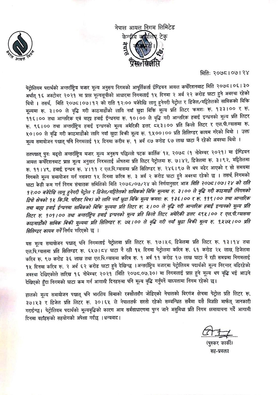 त्यसैगरी अन्तर्राष्ट्रिय उडानतर्फको हवाई इन्धनको मूल्य अब प्रतिकिलोलिटर ८९५ अमेरिकी डलर पुगेको छ । निगमले गत कात्तिक १२ गते पनि तेलमा प्रतिलिटर ३ रुपैयाँ ग्यासमा प्रतिसिलिन्डर ५० रुपैयाँले वृद्धि गरेको थियो ।